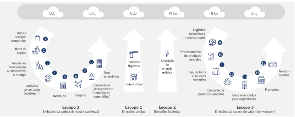 - Escopo 3: todas as demais fontes de emissão indiretas da empresa não incluídas no escopo 2, distribuídas ao longo da sua cadeia de valor. É subdividido em outras 15 categorias, indicadas na figura abaixo.